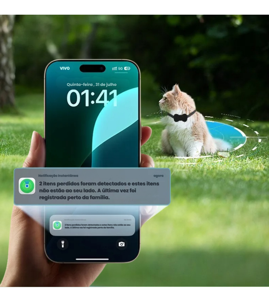 Com o nosso localizador inteligente, você acompanha cada passo do seu companheiro com poucos cliques no celular. Compacto, leve e com bateria de longa duração, ele se adapta perfeitamente à coleira do seu cão ou gato, sem incomodar.